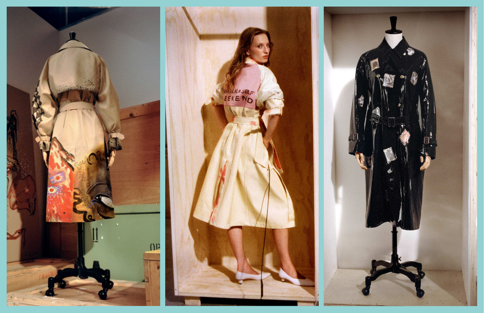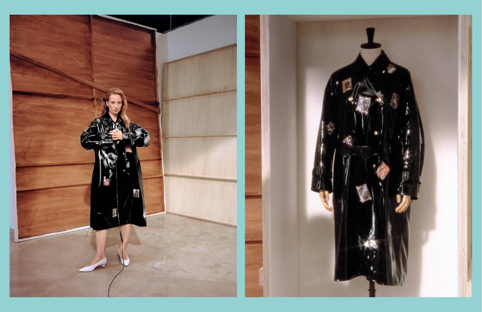 Multidisciplinary artist Tai Shani, who works across performance, film and experimental writing, chose black glossy vinyl for her trench coat. Her practice often explores themes around women, illness and solidarity, while rethinking feminine aesthetics such as floral or gothic styles. According to Shani, the black vinyl turns the trench into a mysterious and symbolic object.