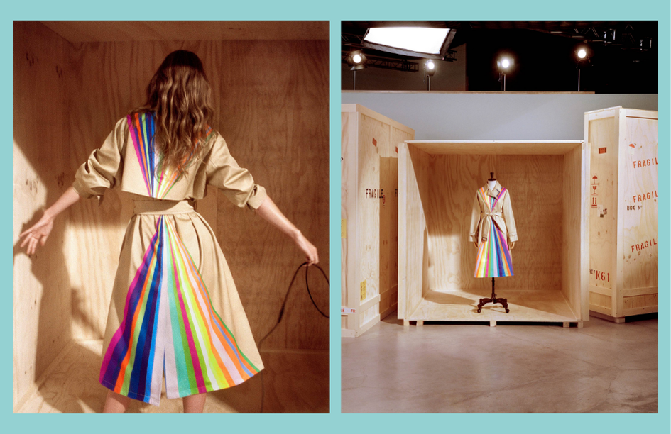 Italian artist Paola Pivi often uses everyday objects in her work, changing their qualities and inviting viewers to rethink reality. Now based in Hawaii, she finds inspiration in the island’s sharp light, flora, fauna and the “double rainbow” that appears almost daily in the sky. This natural phenomenon became the base of her trench design: vertical, colourful stripes on the front and back create an hourglass shape, visually defining the waist.